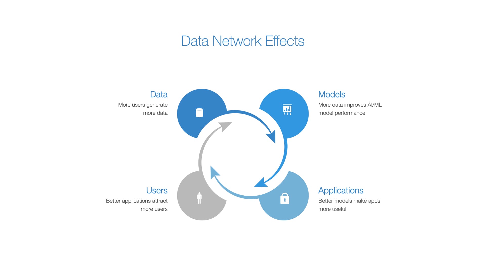 Data benefits from what's known as 'Network Effects.' Here's how it works: More data improves models, leading to more useful applications. These improved applications attract more users, who generate even more data. It's a self-reinforcing cycle that enhances the value and effectiveness of AI technologies.