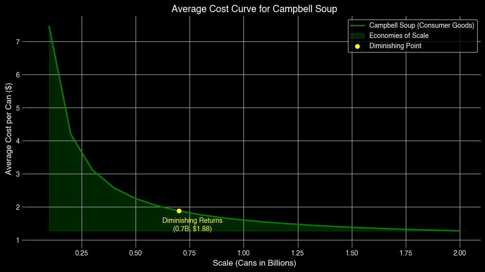 Campbell Soup’s high fixed costs — manufacturing facilities and logistics — enable some economies of scale, but significant variable costs tied to raw materials, transport, and labour limit its ability to achieve the dramatic cost reductions seen in digital or hardware businesses.