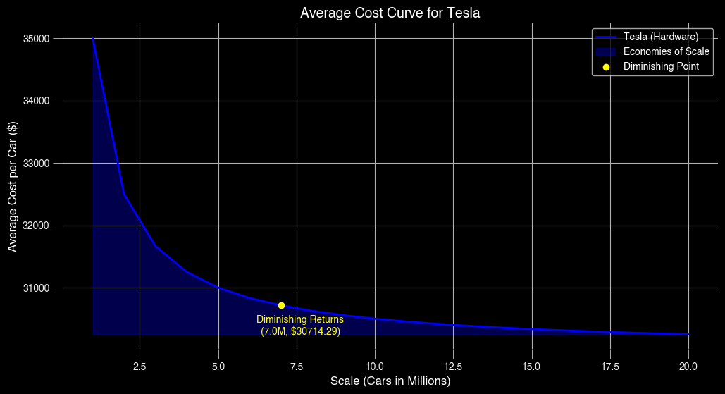 Tesla’s strategy is built on leveraging economies of scale. By producing millions of cars annually, Tesla spreads fixed costs—like those of its Gigafactories—across a vast output, reducing average costs per vehicle and supporting competitive pricing in the EV market.