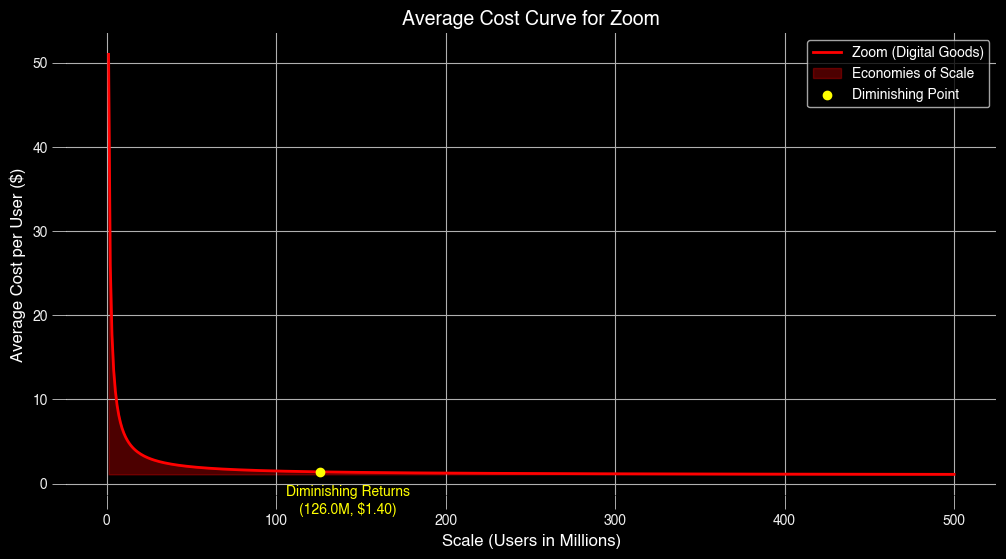 Zoom’s business model exemplifies economies of scale: infrastructure investments are spread across a growing user base, while minimal variable costs (e.g., server bandwidth per user) enable rapid reductions in average costs as the platform scales. Strategies such as free-tier offerings attract users, while enterprise upselling maximises returns.
